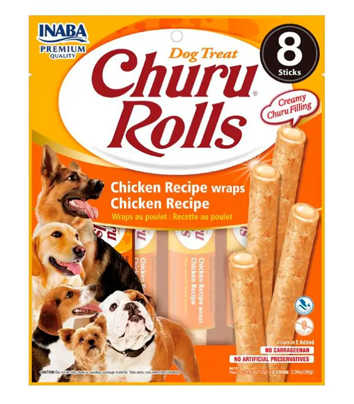 CHURU Rolls for Dog Chicken Recipe Wraps Chicken Recipe es un snack para perros elaborado con pollo. Tiene una presentación en rollos suaves, fáciles de masticar y adecuados como premio diario. Puede ofrecerse directamente como recompensa durante el entrenamiento o como snack ocasional.